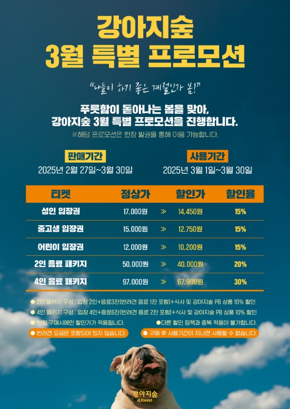 - 입장료: 성인 12,000원 / 어린이 10,000원 (반려견 1마리당 5,000원 추가)